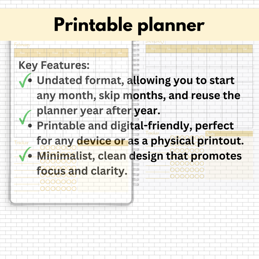 Undated format,Printable and digital-friendly,Minimalist, clean design