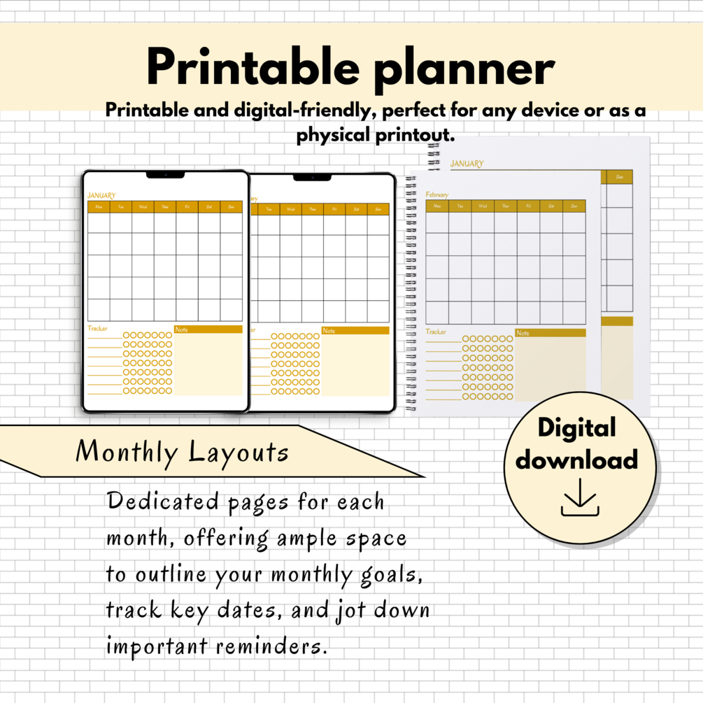Elevate your organization with this beautifully crafted undated monthly planner! Designed to provide flexibility and elegance, this planner allows you to start planning anytime, covering each month from January to December without set dates.