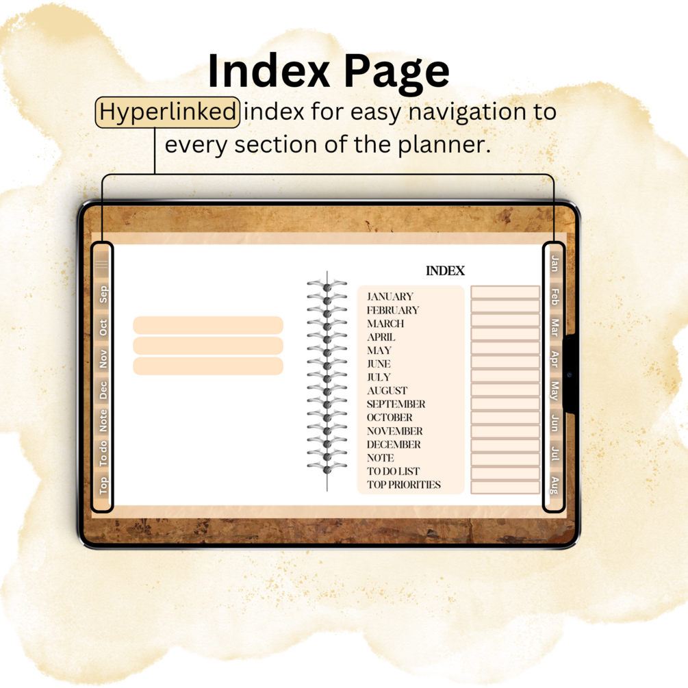 - Index Page: Hyperlinked index for easy navigation to every section of the planner.