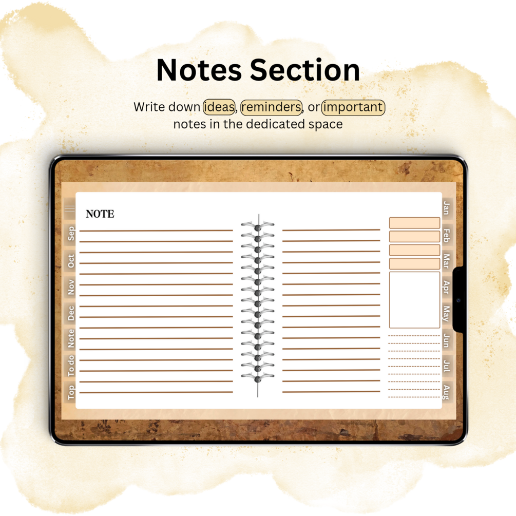- Notes Section: Write down ideas, reminders, or important notes in the dedicated space.